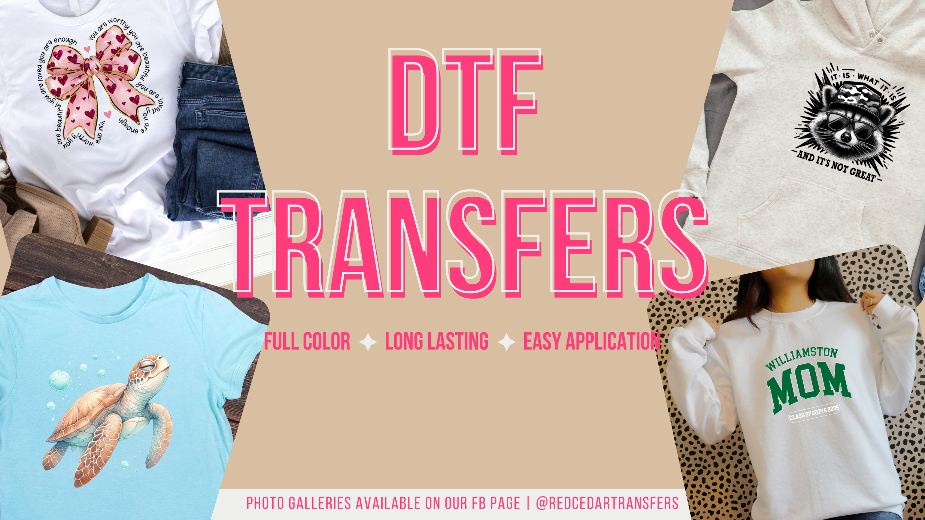 Transfer GuideOrder custom DTF, Sublimation, or Vinyl Transfers. Order transfers by single sheets or build a gang sheet.